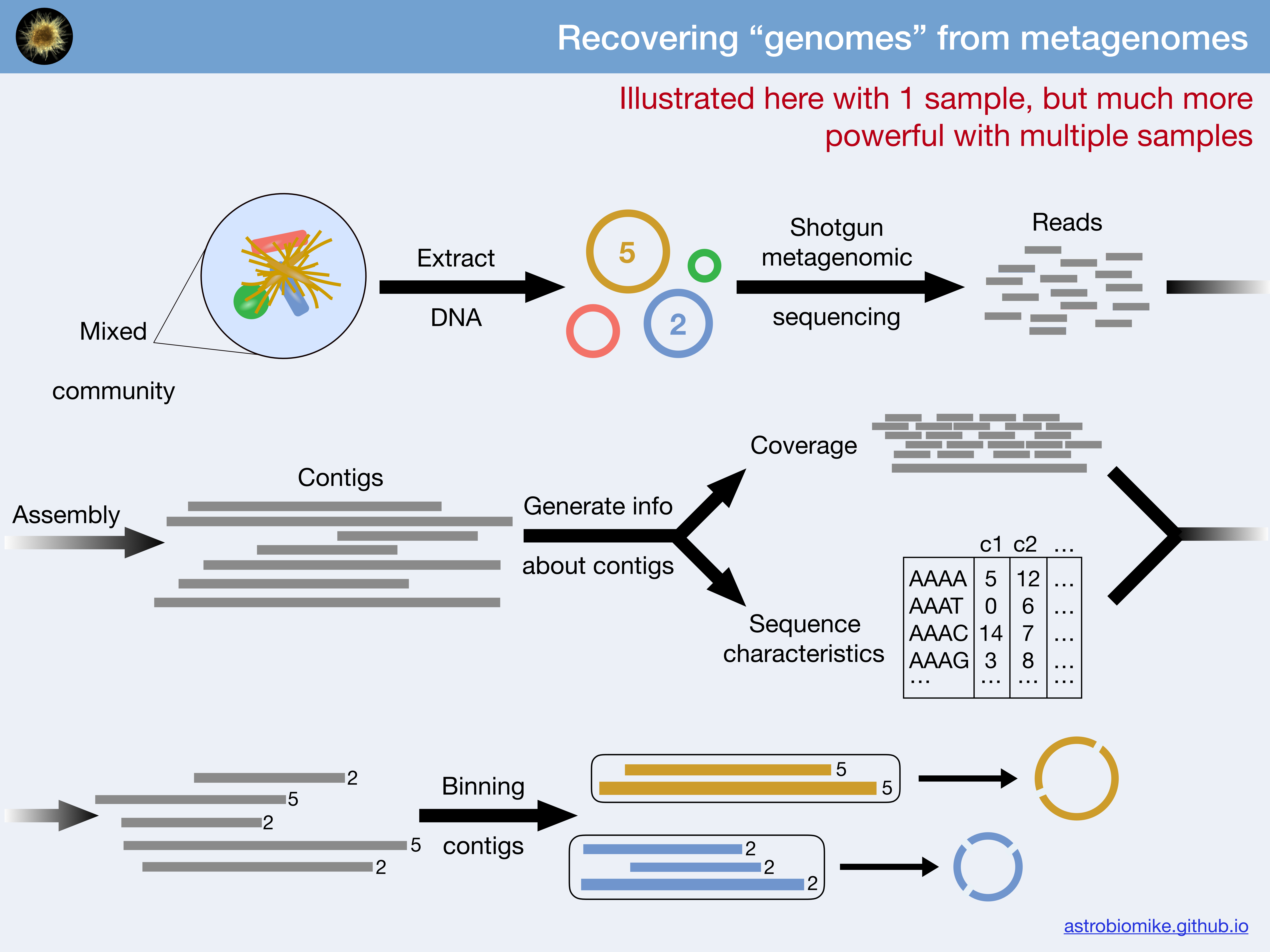 I am a guy who really likes numbers and statistics. Lucky for me, contigs statistics are crucial in genome assembly because they give us important information about the quality and structure of the assembly. Metrics such as the total number of contigs, N50, L50, maximum contig length, and length distribution help assess whether the assembly is sufficiently contiguous to support reliable binning. They also reveal the proportion of short versus long contigs, which is important since binning algorithms rely on sequence composition and coverage signals that are more meaningful in longer contigs. Without this assessment, you risk using assemblies that are too fragmented, introducing noise, or setting inappropriate minimum contig length thresholds, all of which can compromise the quality and interpretability of the recovered genomes (MAGs).